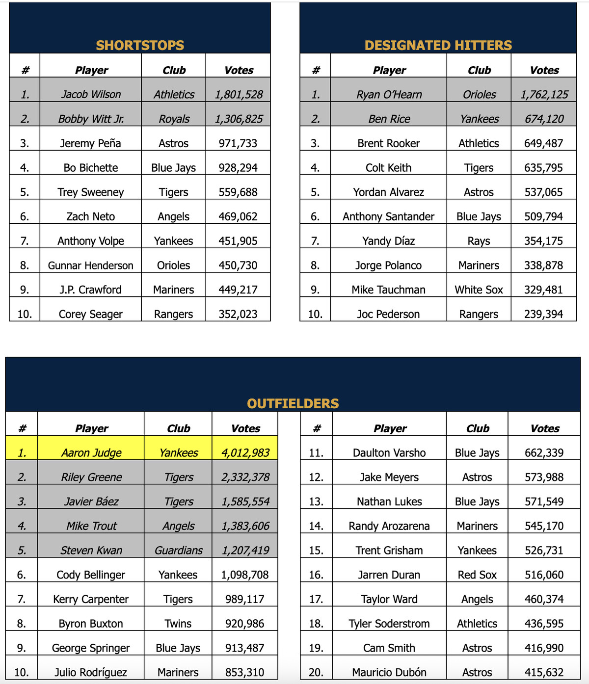 Here are all the first-round voting results. Players highlighted in yellow had the most votes in their respective leagues. First, the American League: