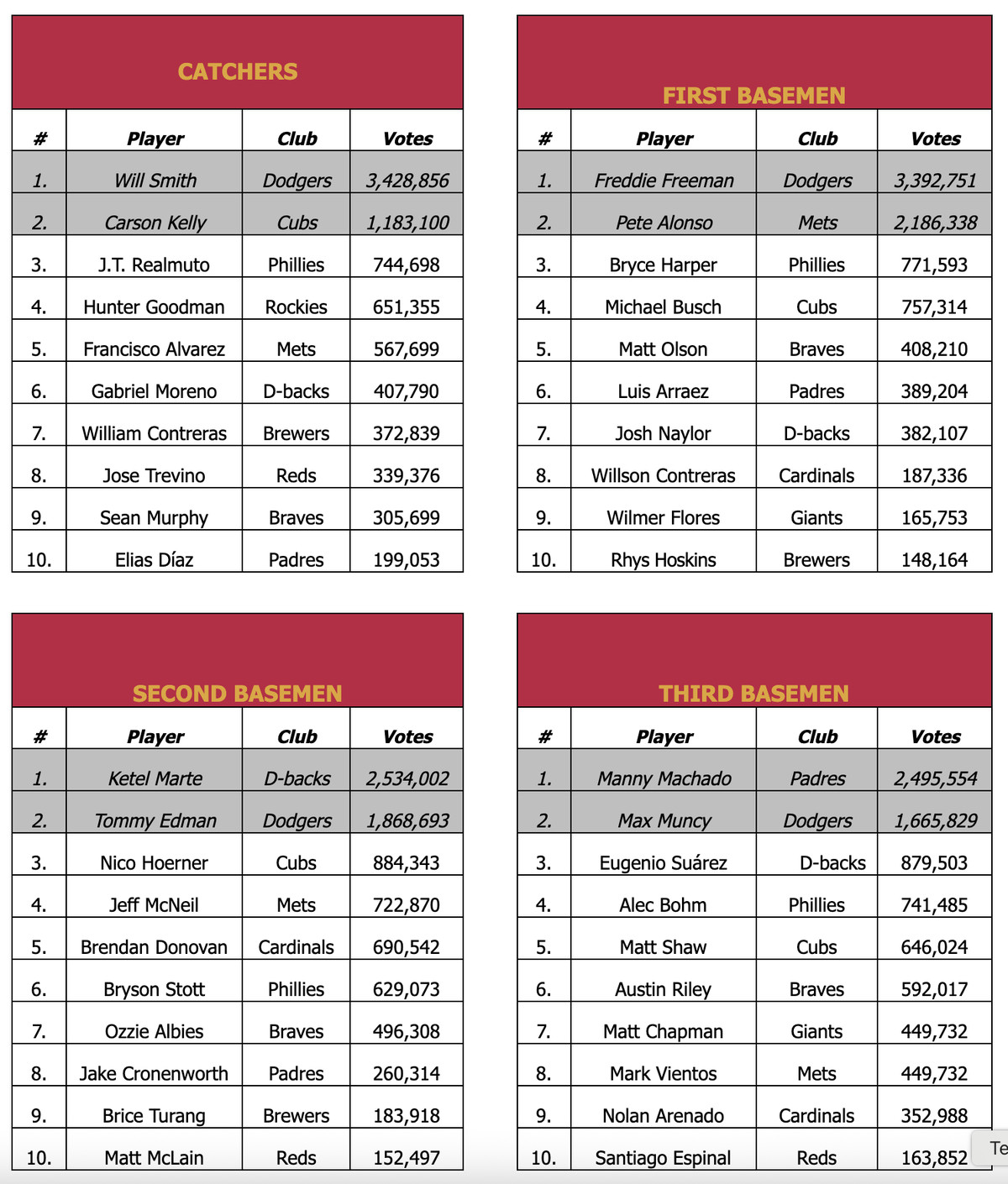 Carson Kelly finished second among NL catchers with 1,183,100 votes, a distant second to Will Smith of the Dodgers (3,428,856). Kelly’s hot start to the season probably got him some votes.