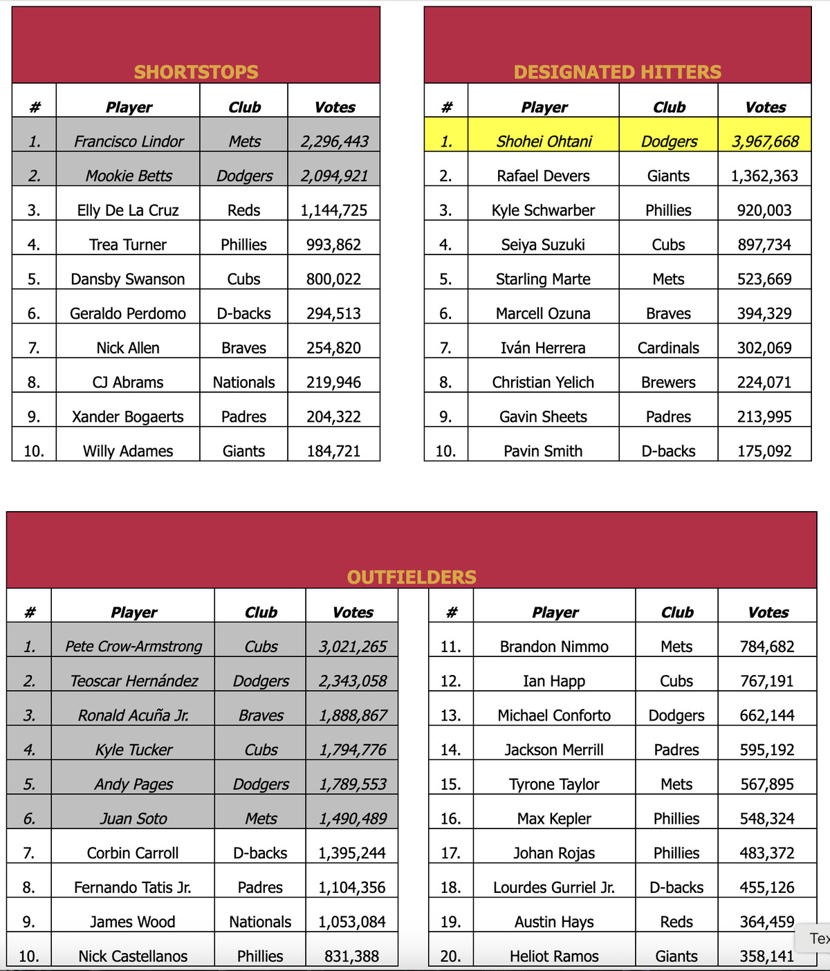 Pete Crow-Armstrong led all National League outfielders with 3,021,265 votes and Kyle Tucker finished fourth with 1,794,776. The top six outfielders head to the final voting phase. The other four outfielders on that ballot; Teoscar Hernández, Ronald Acuña Jr., Andy Pages and Juan Soto.