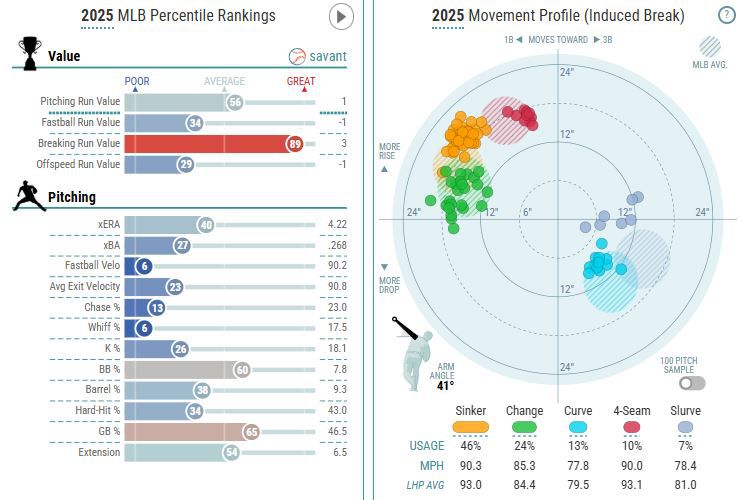Milwaukee’s best player thus far in 2025 has been Brice Turang; the three year veteran second baseman is currently hitting .318/.383/.409 with 3 HR over 150 PA, registering a 125 wRC+ and accruing 1.1 fWAR. Two part-time players (Eric Haase and Jake Bauers) have provided plenty of offensive support; Rhys Hoskins and Sal Frelick have also been above average offensive players for the Brewers.