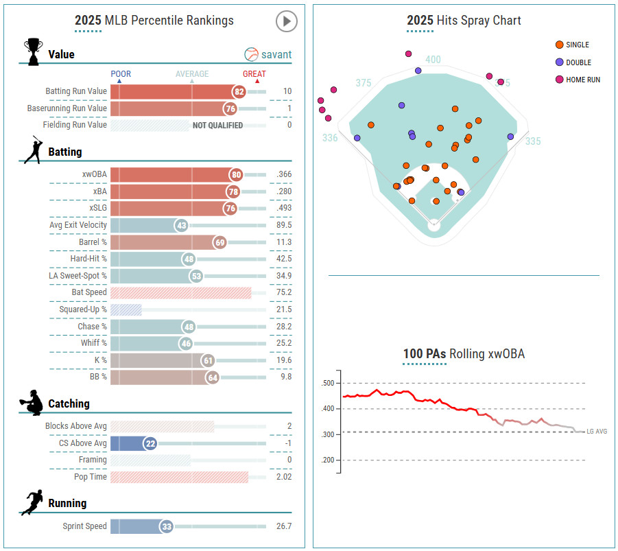 For 2025, his barrel, hard hit and average EV are the only numbers that are really middle of the road. Almost like middle of the road is his floor – an average MLB hitter, well above replacement value. One could peek at his BABIP of .343 and suspect some regression is coming. Then again, this number is lower than either his 2024 or 2023 BABIP. A career .359 BABIP over a full season of PAs is pretty damn lucky, huh?