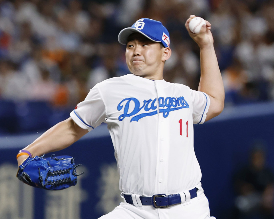 Shinnosuke Ogasawara of the Chunichi Dragons pitches against the Yomiuri Giants in a Central League game at Vantelin Dome Nagoya on Aug. 9, 2024. (Kyodo)