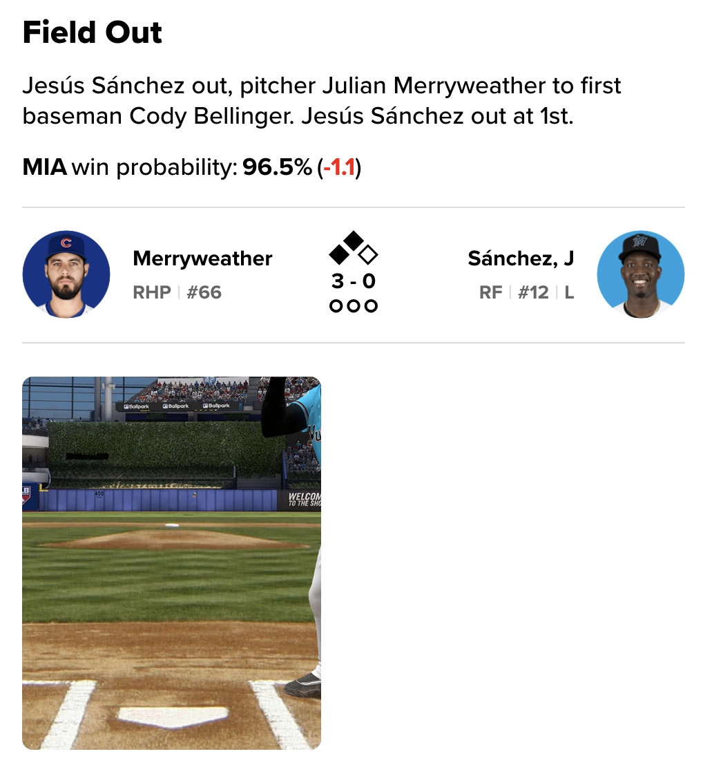 The Cubs trailed just 3-1 heading to the bottom of the eighth and it was, at least, theoretically possible for them to come back. But Julian Merryweather had a disastrous eighth inning and that put the game out of reach, ending with a final score of Marlins 7, Cubs 2.