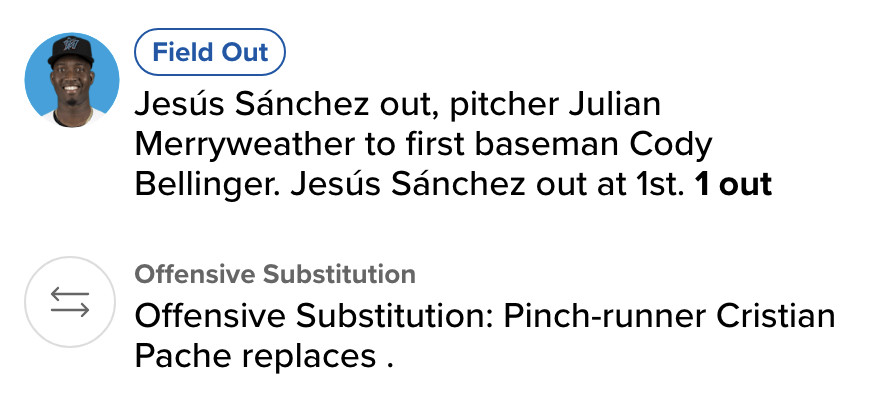 So the bases should have been loaded with nobody out, but Merryweather threw the ball over to Cody Bellinger playing first base, and Bellinger stepped on the bag. A bit of confusion followed, with the umpires conferring and then ruling Sánchez out. Unfortunately, I don’t have video to post here but what happened is this: Sánchez trotted toward first base but never touched it before the Marlins sent Cristian Pache out to run for him. Well… that doesn’t work, folks, the batter who’s intentionally walked has to touch first base before he leaves the game. So, on appeal, Sánchez was called out. Here’s how Gameday scored it:
