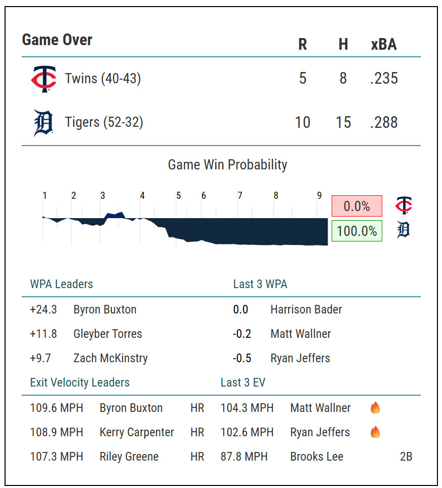 And then, more fuel for the “what the hell is Bailey Ober doing out here if him hips ain’t healthy” fire — another leadoff homer in the sixth, this time from Zach McKinstry. A game that the Twins had led early was now a 7-2 Detroit lead, and Ober’s final line included 5.2 innings, 11 hits, 7 earned runs, one walk, and four homers. I’m not sure what the justification is for the notion that we are currently sending our best and brightest.