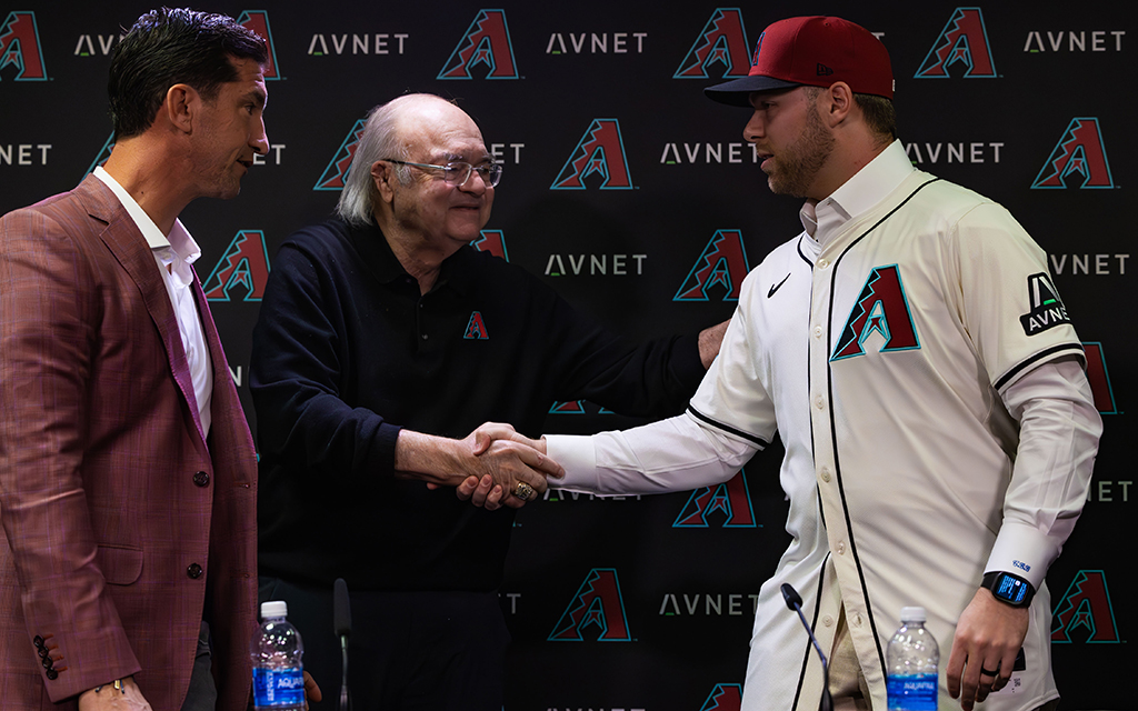 Diamondbacks general manager Mike Hazen, left, watches as managing general partner Ken Kendrick, center, shakes hands with newly signed pitcher Corbin Burnes after Burnes first donned his jersey Wednesday. (Photo by Samuel Nute/Cronkite News)
