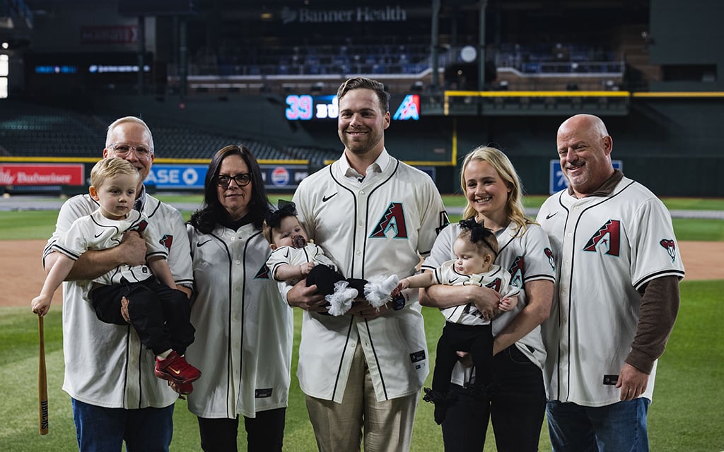 Newly signed Arizona Diamondbacks right-handed pitcher Corbin Burnes poses with his family at Chase Field after officially signing his contract with the Diamondbacks Wednesday. Burnes’ family was the main reason the Cy Young Award winner signed with the team. (Photo by Samuel Nute/Cronkite News)
