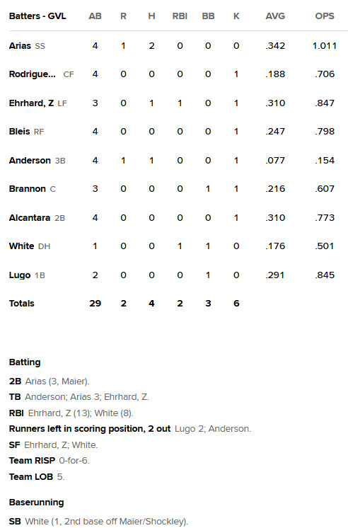 The Drive went ahead early in this one, leading Rome (ATL) 2-0 on a pair of sacrifice flies. Unfortunately, the bats went cold after the second inning, with Greenville managing just four hits. Two of those came from standout shortstop Franklin Arias, batting .342 on the season.