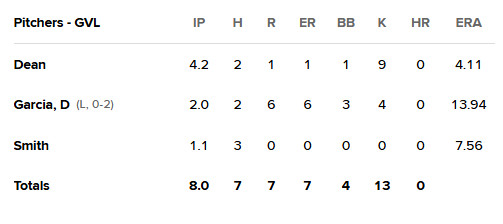 Starting pitcher Noah Dean was fantastic, striking out nine in 4 2⁄3 innings and allowing two hits. He handed the ball to Darvin Garcia, who allowed three runs to score in the fifth on wild pitches and a balk. Garcia allowed three more runs in the seventh, which opened the floodgates in the 7-2 loss.