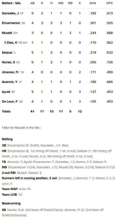 Finally, a win! And a wild one, at that. Third baseman Freili Encarnacion was the standout in this one, hitting his sixth home run in the first inning and adding an RBI double in extra innings to cap a 3-for-4 day with three runs and three RBI. Catcher Kleyver Salazar also had a huge day, going 2-for-5 and knocking in five runs, including a three-run home run that put Salem ahead 9-8 at the time. Starlyn Nunez added his third home run on a two-hit day.