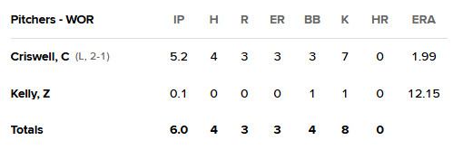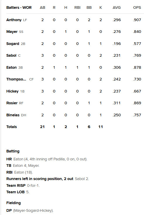 Outside of a solo home run from Nate Eaton (4) in the fourth inning, there was little to speak of with the bats as Marcelo Mayer had the only other hit, as well as a walk. Roman Anthony walked twice, improving his OBP to .420 on the season. The game was called with Worcester batting, and one out in the top of the seventh inning, dropping the Woo Sox to 18-17 on the season.