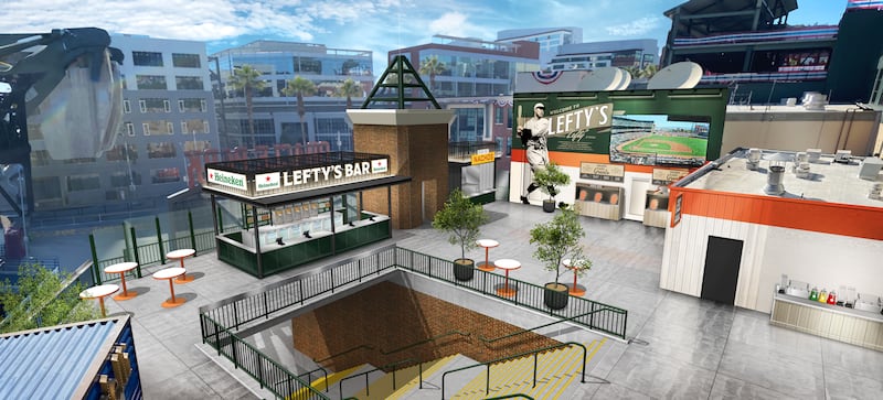 Lefty’s Patio sits on the first base side of Oracle Park near the bridge that connects the stadium to the Giants’ Mission Rock development on the other side of McCovey Cove. Aramark Sports + Entertainment ‘Balancing The Building’
