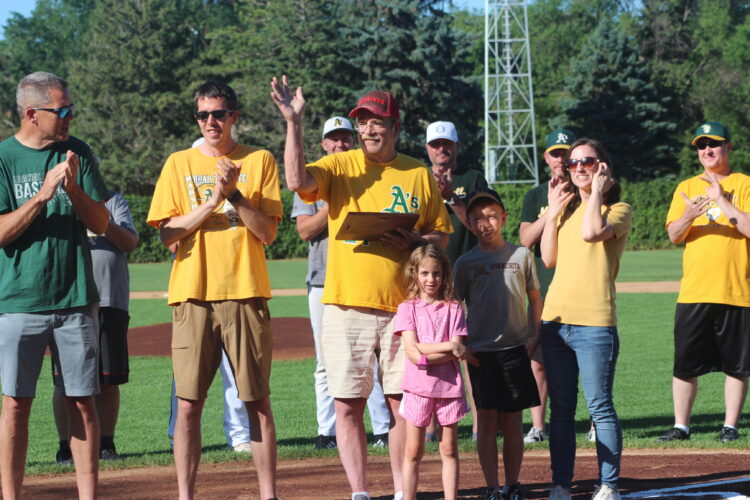 Shaikoski was presented with a plaque at home plate by current President of the Marshall Baseball Association [MBA] Kelly Loft, along with other MBA board members and his family’s support.
