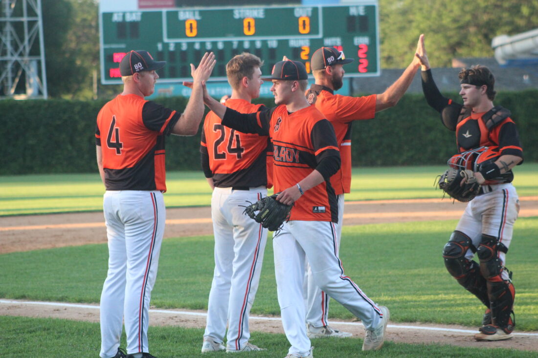 Photos by Samantha Davis. Milroy Yankees’ Parker Schmitt (front) hi-fives his teammates after a 2-1 win over the Marshall A’s on Sunday at Legion Field. Schmitt tossed seven strikeouts while allowing no hits in his four innings pitched.