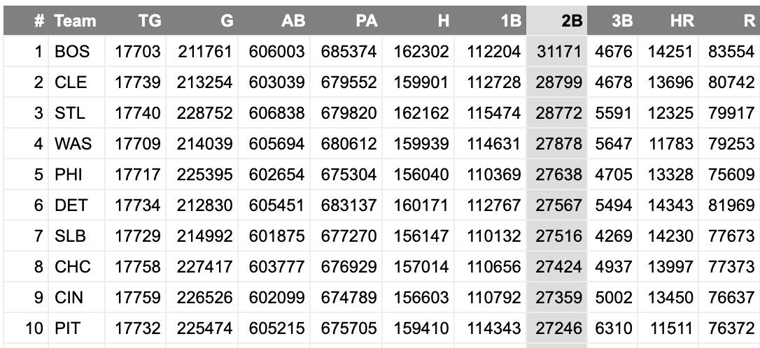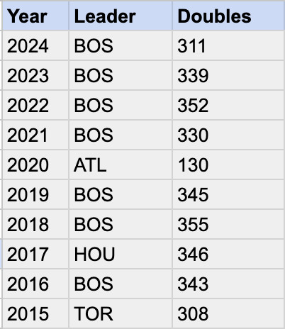 Here’s a list of the MLB team leaders in doubles over the past 10 years. Let me know if you notice anything interesting: