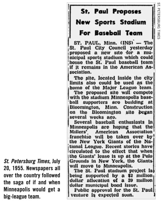 What eventually happened is that the Indians couldn’t get out of their lease (sound familiar?), and Dodgers owner Walter O’Malley convinced Giants owner to pick San Francisco instead. Whether just to have some company in California, or because O’Malley also owned the St. Paul Saints and didn’t want them to fold just yet. (Both the Millers and Saints were folded when the Twins moved here in 1962.)