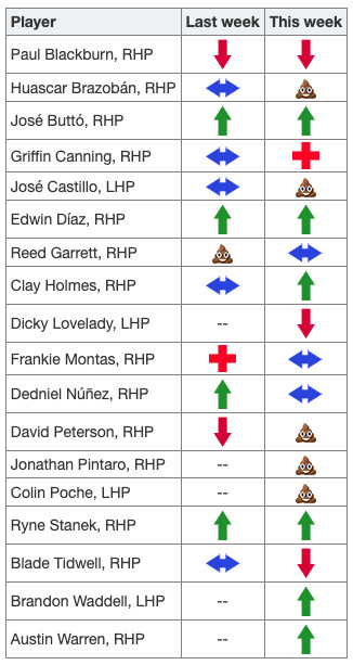 One new name on this week’s meter is Frankie Montas, who finally made his Mets debut on Tuesday. That went really well, but his second start on Sunday went about as far from well as you can imagine. Montas held a potent Braves offense scoreless for five innings and then turned around and coughed up six runs in four innings to the league’s worst offense. You can’t predict baseball, Suzyn.