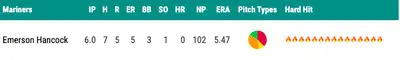 It’s been a tough go over the last few starts for Emerson Hancock, although it was easy enough to handwave away: the Wrigley game, with the wind and the intense heat, followed by the nightmarish rain delay in Minnesota; these are conditions that would test any pitcher. But tonight it was pleasant, sunny and calm in Seattle in front of a home crowd of 22,351 (and several hundred dogs), hyped-up from an exhilarating win last night. But what should have been a soft landing for Hancock was anything but, as he struggled and scrapped through six grueling innings, allowing the Royals to score five runs on seven hits, including several spicily-hit balls. This is, uh, not what you want to see from your starter: