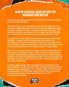 “Having the chance to work alongside Bob every day, we’re really fortunate to have such an experienced leader and one of the most well-respected managers in baseball,” Giants president of baseball operations Buster Posey said in a news release. His leadership, preparation, and connection with our players have been invaluable, and we believe he’s the right person to continue guiding this team forward.”