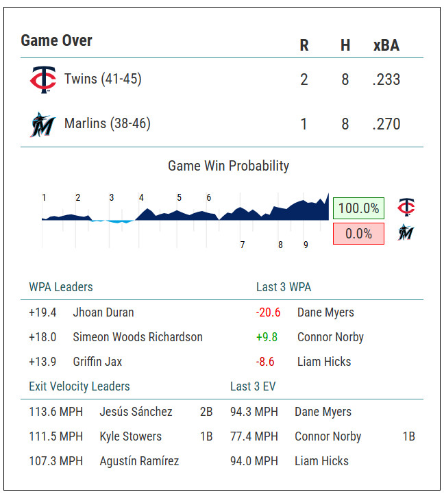 Things were, mercifully, much quieter for the rest of the night. Griffin Jax worked a clean eighth, and Jhoan Duran induced a game-ending double-play grounder to put this one on ice.