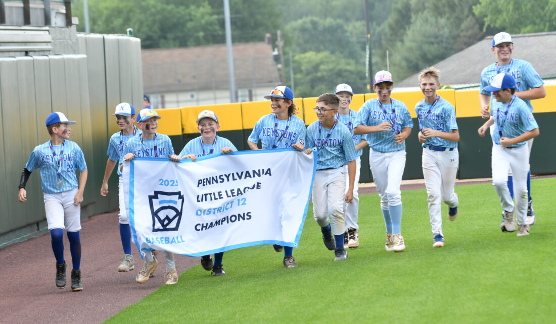 Keystone Little League Majors team mates jog around the field with their championship banner after winning the District championship at Volunteer Stadium Wednesday.