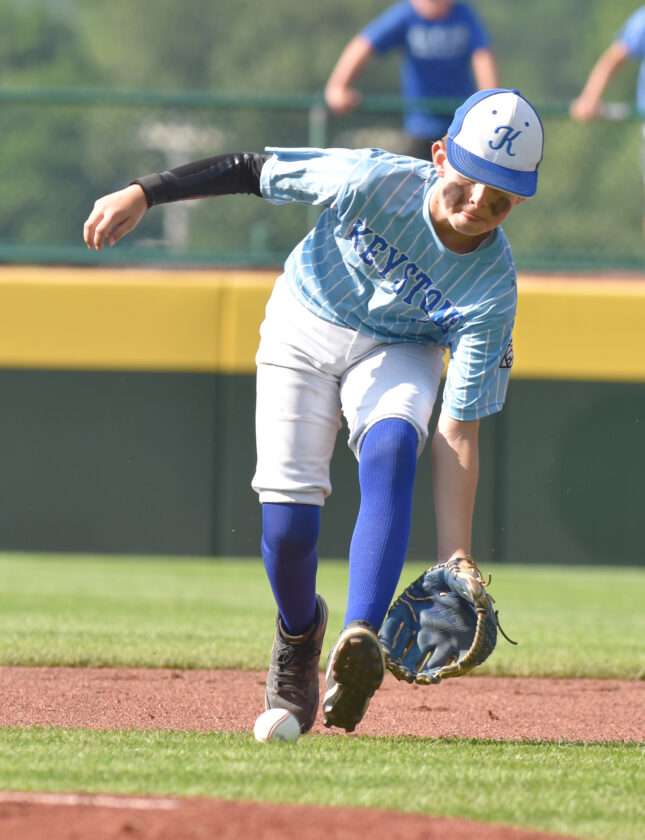 Keystone first baseman Dylan McDermott fields a ground ball for an out at first base in the second inning of the Little League Majors District Championship at Volunteer Stadium Wednesday.