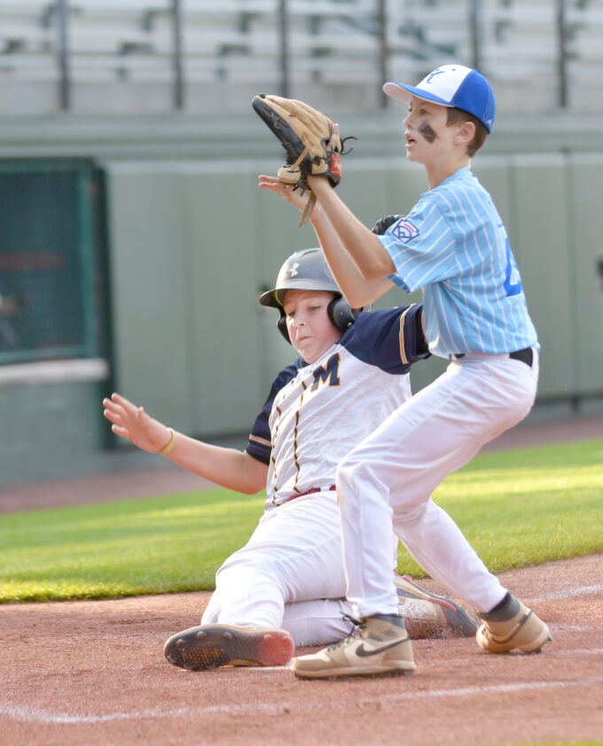 Montoursville’s Liam berry scores on a passed pitch at Keystone pitcher Carter Leone fields the throw in the fifth inning of the Little League Majors District Championship at Volunteer Stadium Wednesday.
