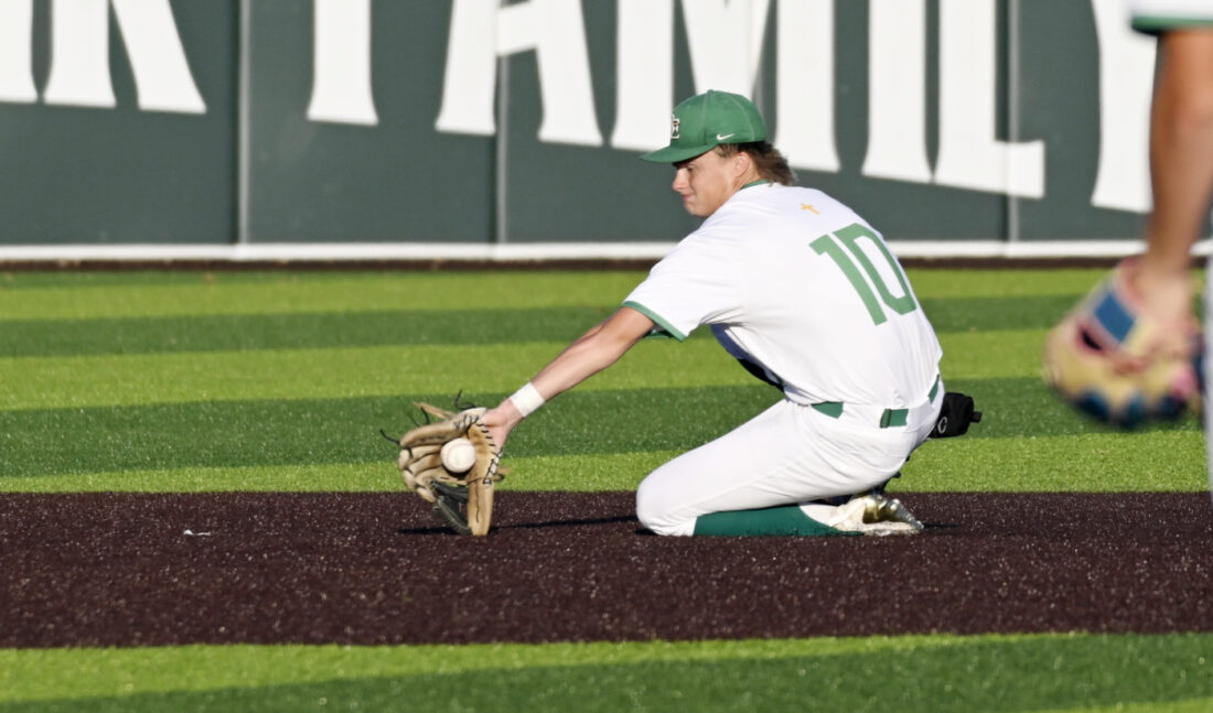 Messenger photo by Britt Kudla: Jack McElroy of St. Edmond fields a ground ball against Bishop Garrigan on Thursday night at Rogers Park. For more photos, please visit CU.messengernews.net