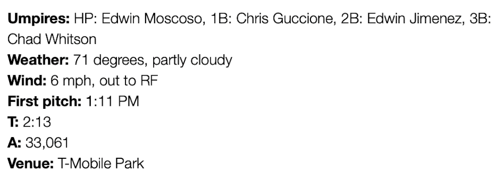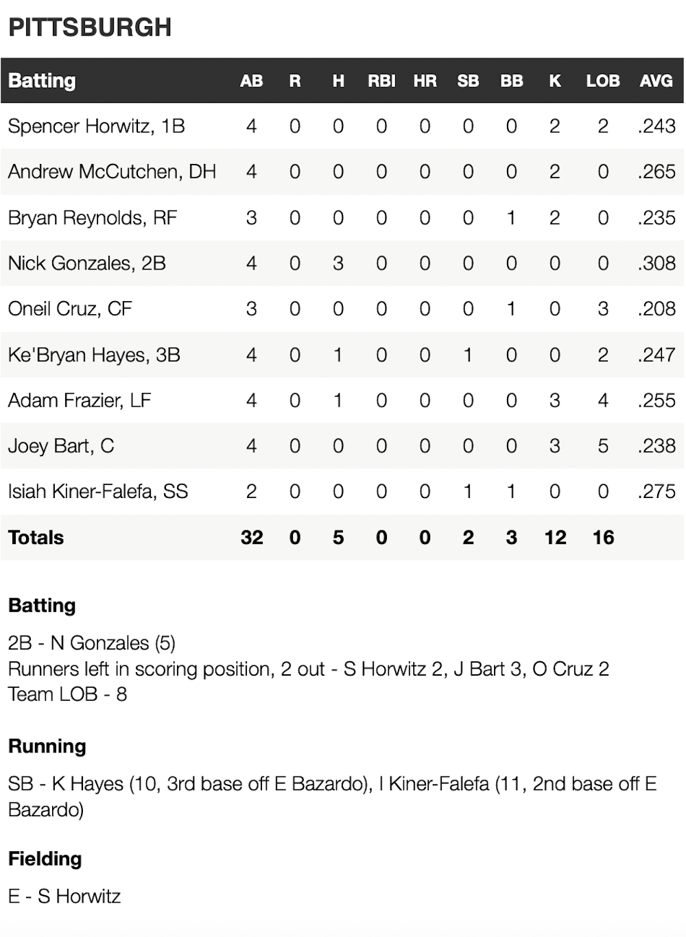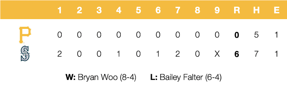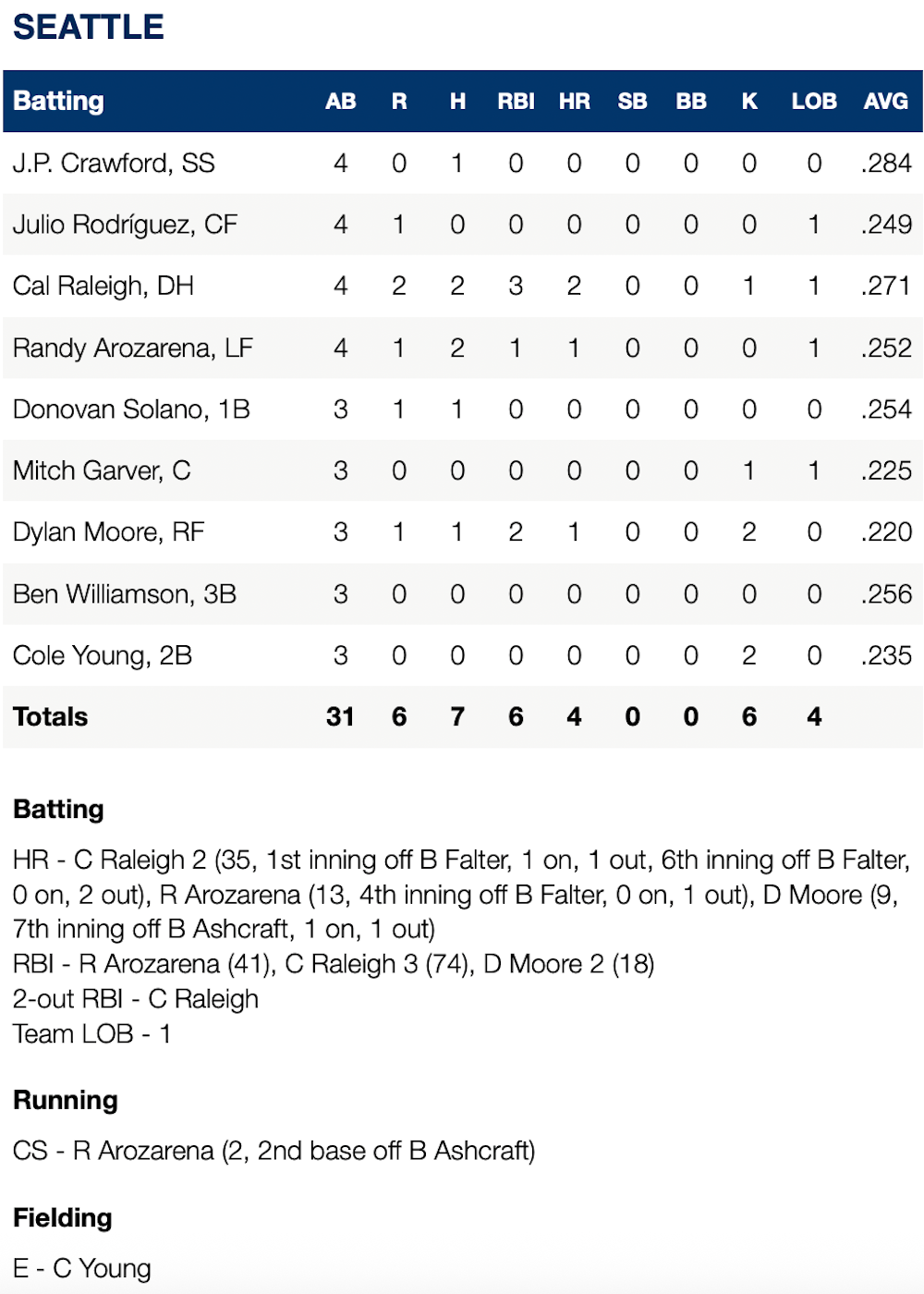 The loss ended two remarkable runs for the Pirates, in that they’d won six in a row and their pitchers had strung together 31 scoreless innings, the latter ending on Raleigh’s first home run, a two-run shot, in the first inning, and they hadn’t bee shut out since June 2. All of it went poof.