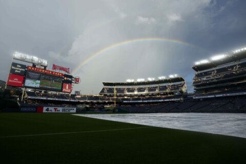 A rainbow forms while a tarp is on the field as the start of a baseball game between the Washington Nationals and the Colorado Rockies is delayed due to weather at Nationals Park, Wednesday, June 18, 2025, in Washington. (AP Photo/Jess Rapfogel)(AP/Jess Rapfogel)