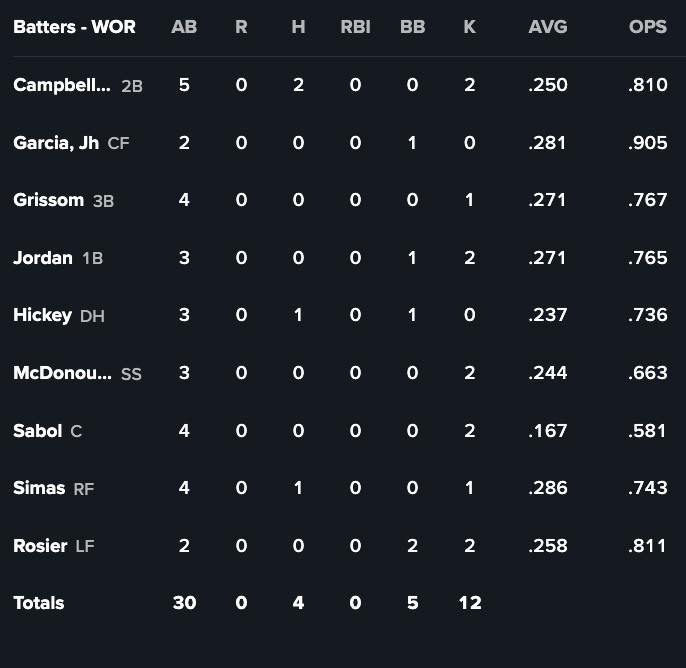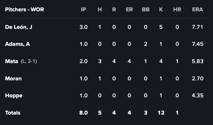 It was a bullpen game for the WooSox against the Mets in Syracuse, and they looked pretty solid, striking out twelve; the only pitcher to let one out of the park was Bryan Mata. Sadly, it was that three-run ball that was all the difference, since even without it, it’s hard to win when you don’t score any runs. Worcester had just four hits on the night, two coming off the bat of leadoff man Kristian Campbell, who has shifted back to second base. The WooSox were also rung up twelve times on the night and stranded ten men, another difficult thing to win with.