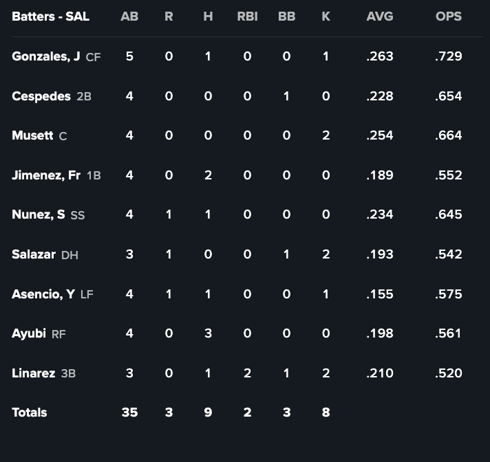 It’s rare to get a three-hit night from an eight-hole hitter, but Salem will certainly take it if it comes, as Karim Ayubi went 3-for-4 with a double in Lynchburg (Guardians A). Unfortunately, he was stranded all three times, in a total of eight men left on base for Salem, the theme of the night across the farm. Ben Hansen had a good night on the mound, but just didn’t go long enough, and Austin Ehrlicher had a forgettable three innings, though the winning run was given up by Nicolas De La Cruz. In the end though, it’s tough to win when you go 2-for-12 with runners in scoring position.