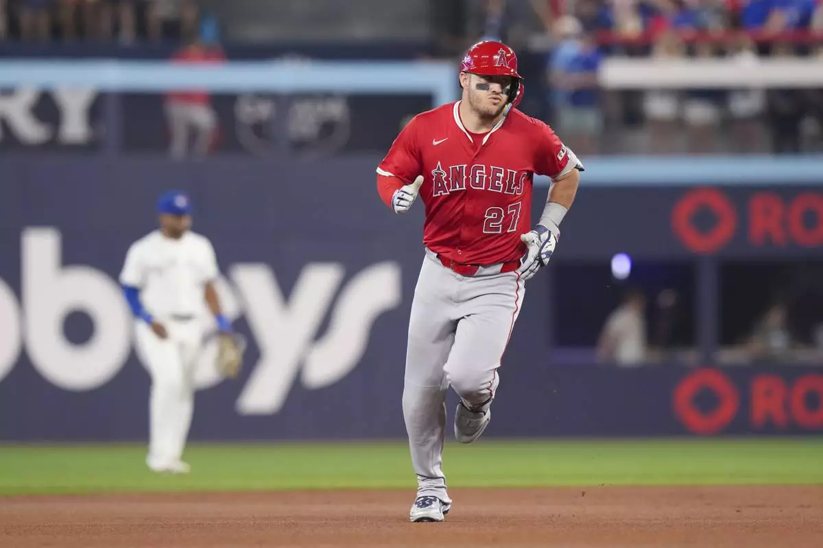 Los Angeles Angels’ Mike Trout (27) rounds the bases after hitting a solo home run off Toronto Blue Jays pitcher Kevin Gausman during first-inning baseball game action in Toronto, Sunday, July 6, 2025. (Chris Young/The Canadian Press via AP)