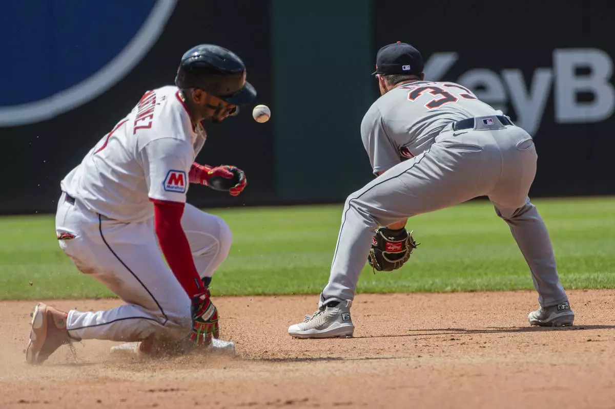 Cleveland Guardians’ Angel Martinez, left, slides safely into second base as Detroit Tigers’ Colt Keith waits for the throw during the seventh inning of a baseball game, Sunday, July 6, 2025, in Cleveland. (AP Photo/Phil Long)