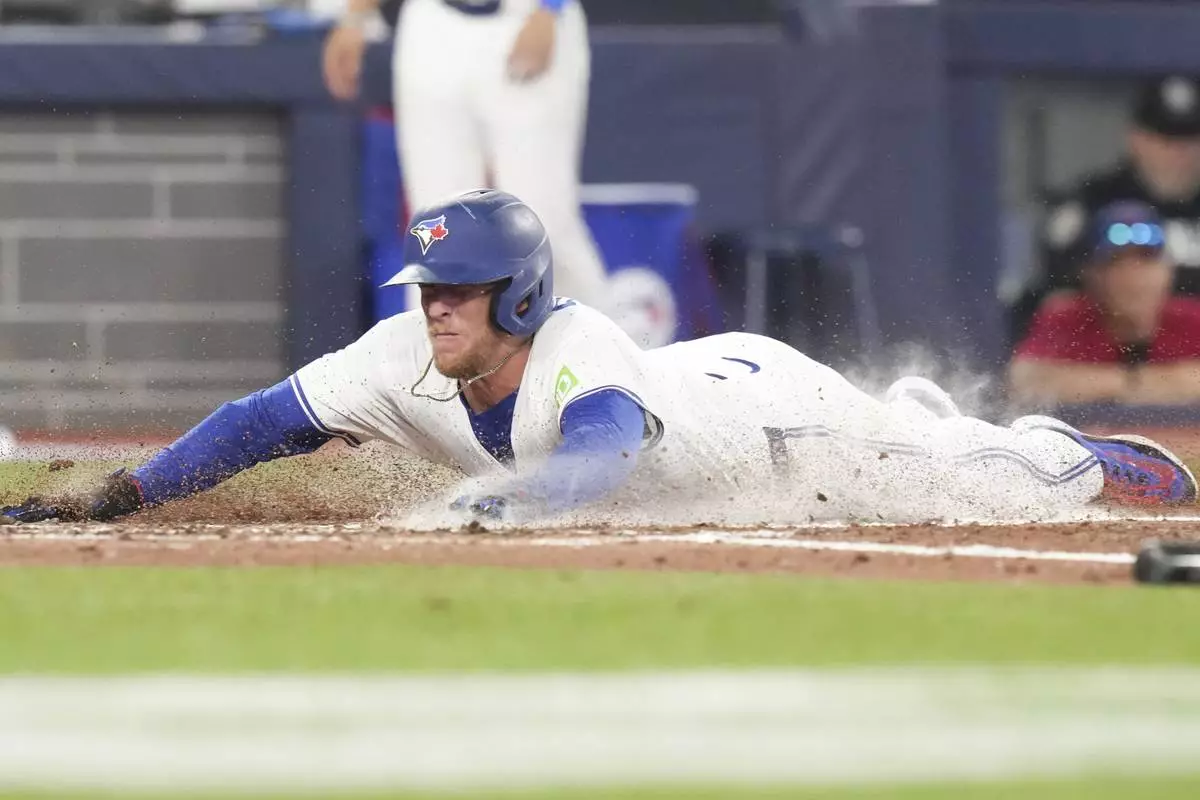 Toronto Blue Jays’ Myles Straw scores on an RBI single by teammate Joey Loperfido off Los Angeles Angels pitcher Tyler Anderson during fourth -inning baseball game action in Toronto, Sunday, July 6, 2025. (Chris Young/The Canadian Press via AP)