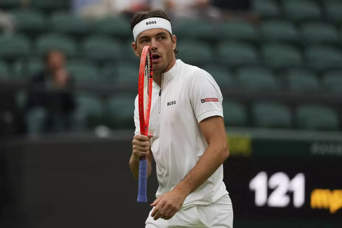 Taylor Fritz of the U.S. reacts during his men’s singles fourth round match against Jordan Thompson of Australia at the Wimbledon Tennis Championships in London, Sunday, July 6, 2025.(AP Photo/Joanna Chan)
