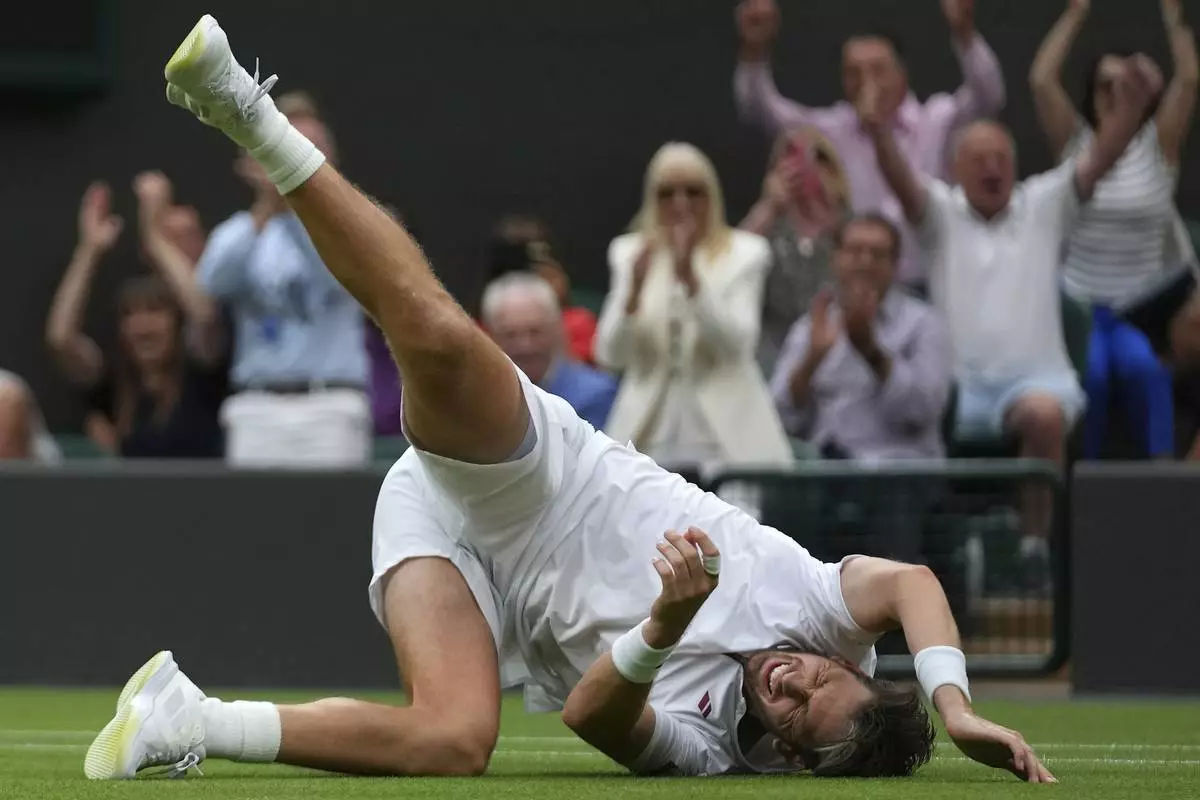 Cameron Norrie of Britain celebrates winning his men’s singles fourth round match against Nicolas Jarry of Chile at the Wimbledon Tennis Championships in London, Sunday, July 6, 2025.(AP Photo/Joanna Chan)