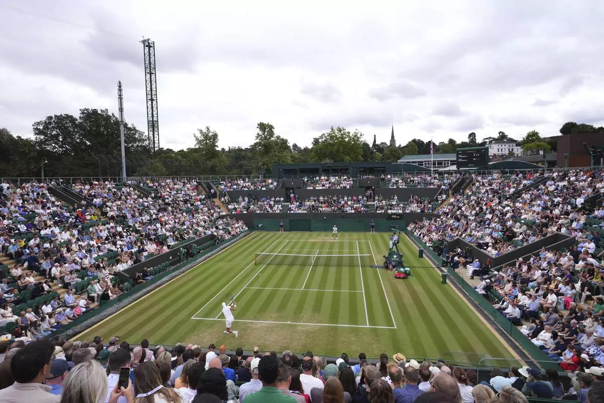 General view at Court two as Karen Khachanov of Russia plays a return to Kamil Majchrzak of Poland during their men’s singles fourth round match at the Wimbledon Tennis Championships in London, Sunday, July 6, 2025.(AP Photo/Kirsty Wigglesworth)