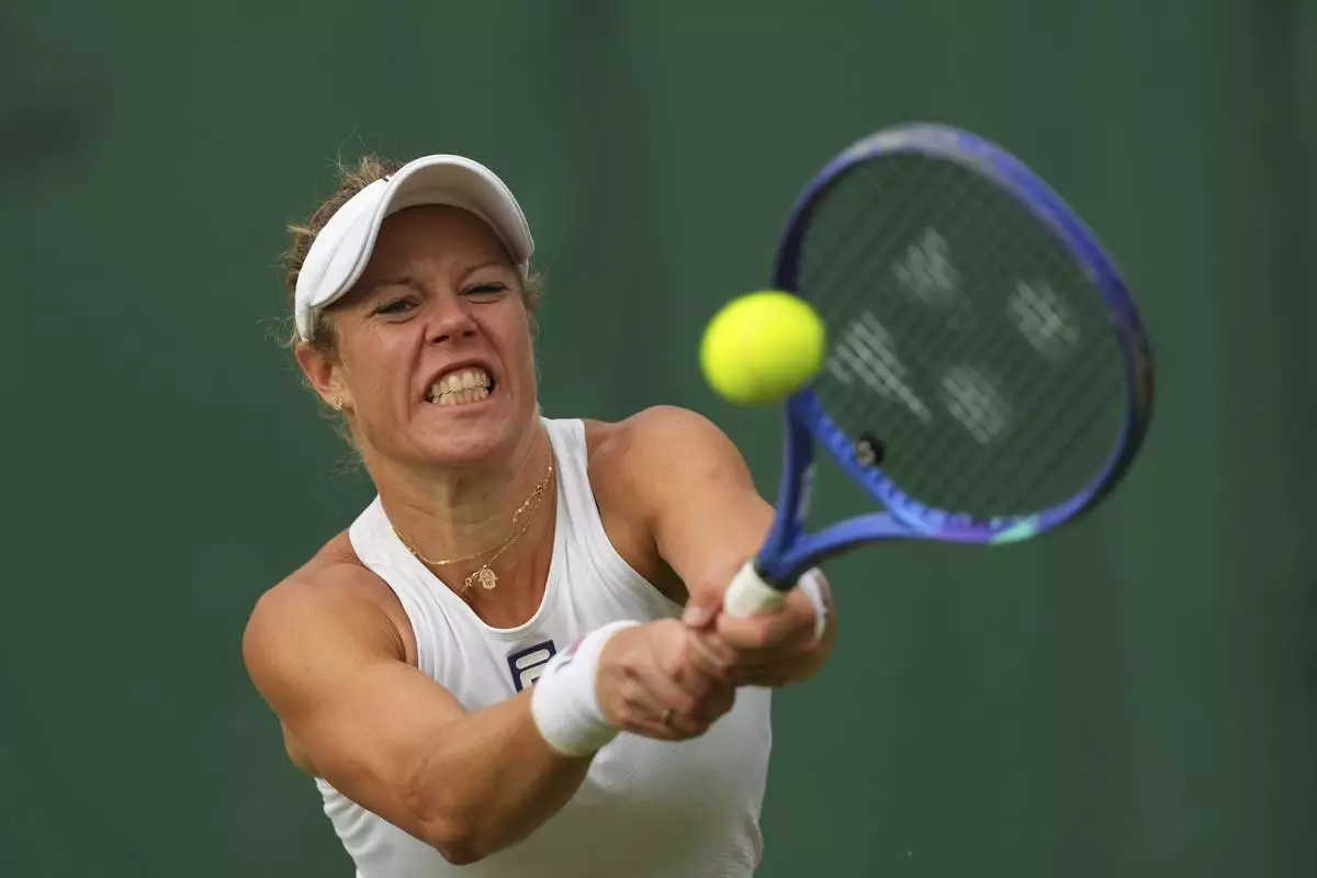 Laura Siegemund of Germany returns the ball to Solana Sierra of Argentina during their women’s singles fourth round match at the Wimbledon Tennis Championships in London, Sunday, July 6, 2025.(AP Photo/Kirsty Wigglesworth)