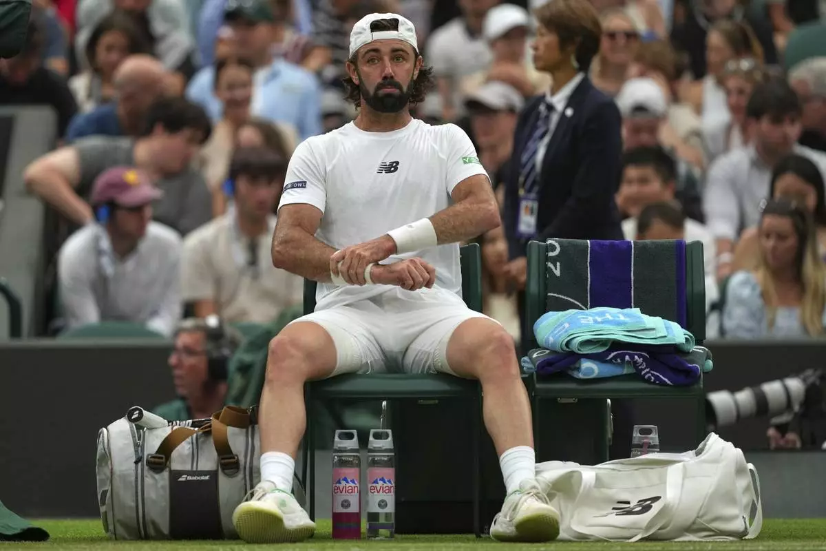Jordan Thompson of Australia rests on his chair during his men’s singles fourth round match against Taylor Fritz of the U.S. at the Wimbledon Tennis Championships in London, Sunday, July 6, 2025.(AP Photo/Joanna Chan)