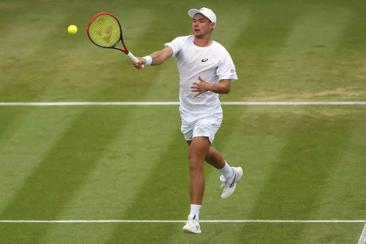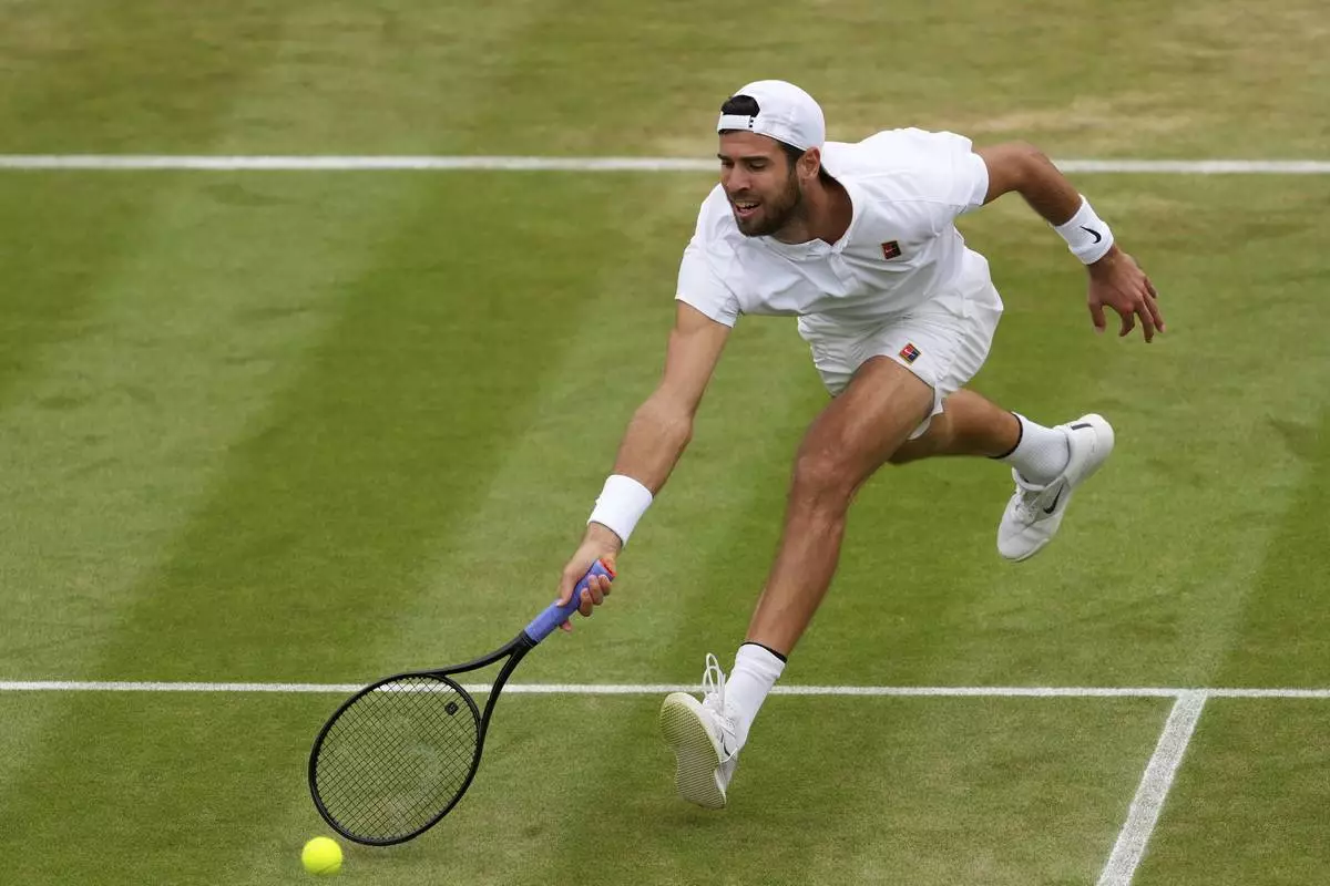 Kamil Majchrzak of Poland plays a return to Karen Khachanov of Russia during their men’s singles fourth round match at the Wimbledon Tennis Championships in London, Sunday, July 6, 2025.(AP Photo/Kirsty Wigglesworth)