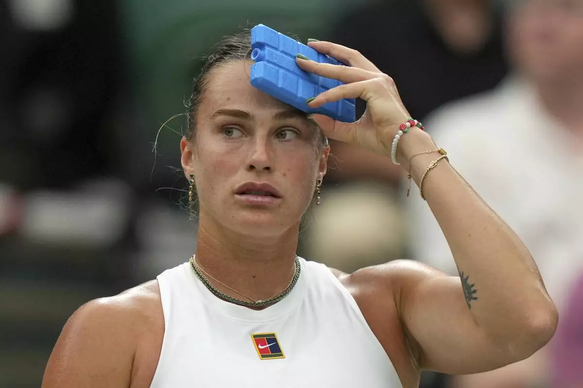 Aryna Sabalenka of Belarus uses an ice pack to keep cool during a change of ends break as she plays Belgium’s Elise Mertens during a fourth round women’s singles match at the Wimbledon Tennis Championships in London, Sunday, July 6, 2025. (AP Photo/Alastair Grant)