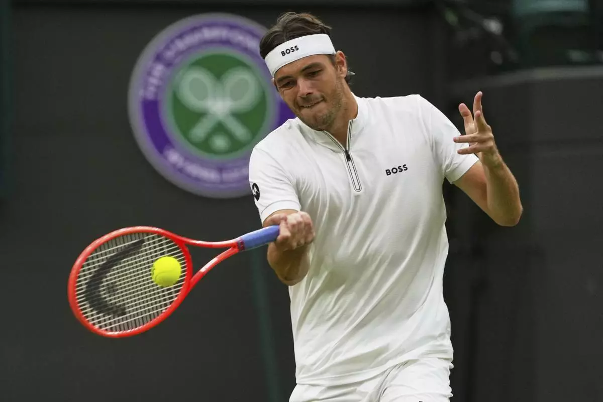 Taylor Fritz of the U.S. plays a return to Jordan Thompson of Australia during their men’s singles fourth round match at the Wimbledon Tennis Championships in London, Sunday, July 6, 2025.(AP Photo/Joanna Chan)