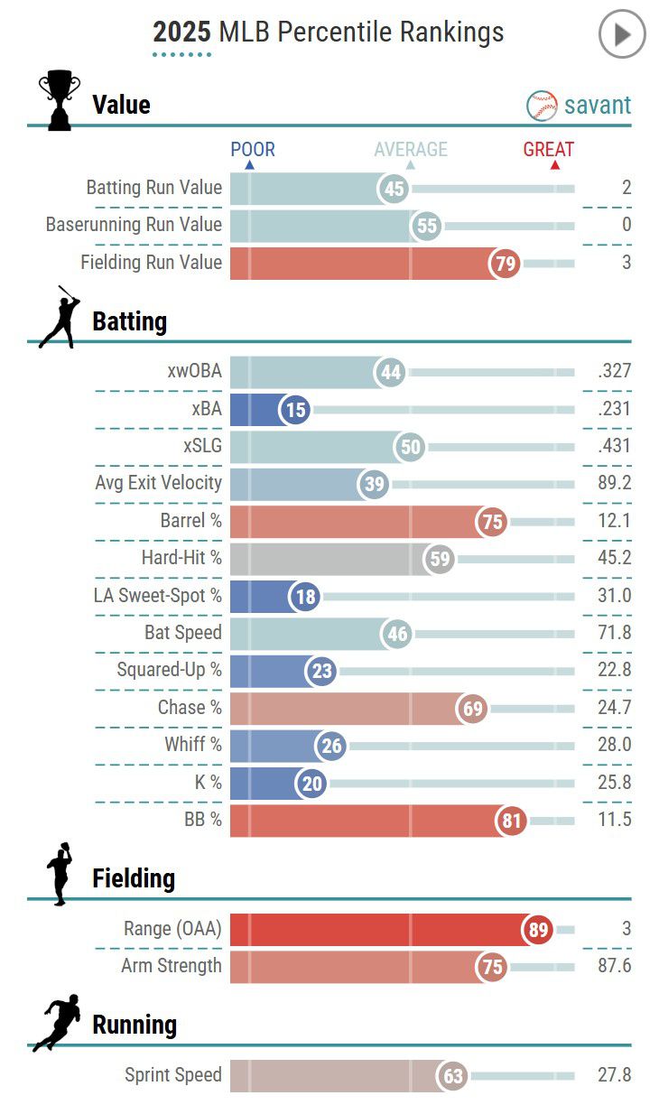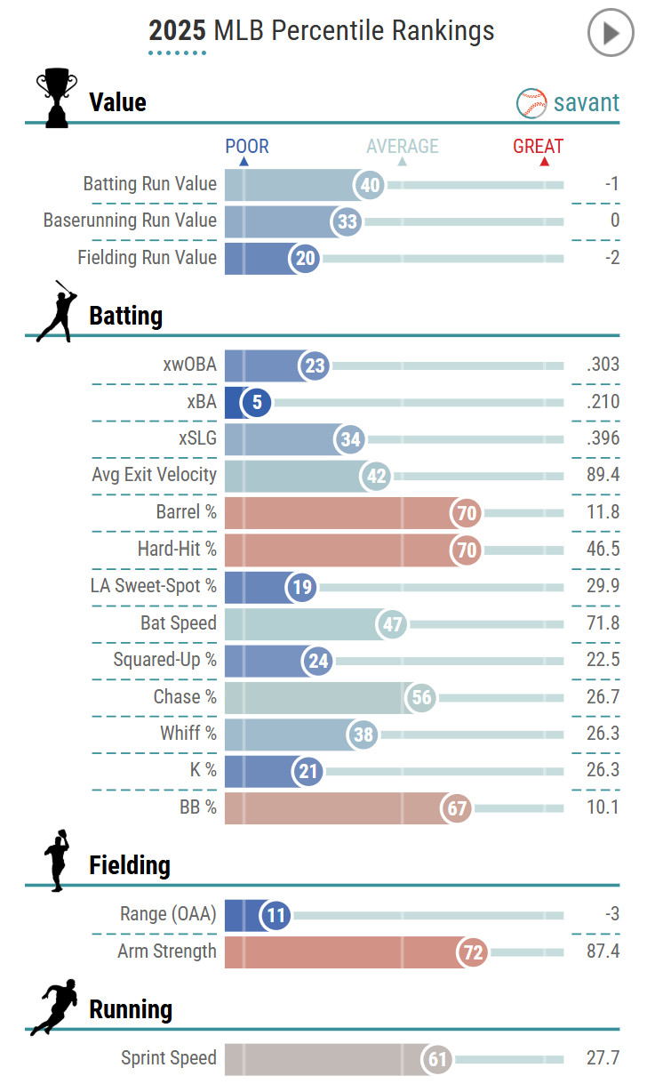 That just looks like peaks and canyons: /\/\/\/\, so it’d be reasonable to expect that this current hot streak won’t soft land into league average production, it’ll crater into the zone of his first ~180 PA for another spell: .217/.297/.233. August has been the best month of his career by far, too: