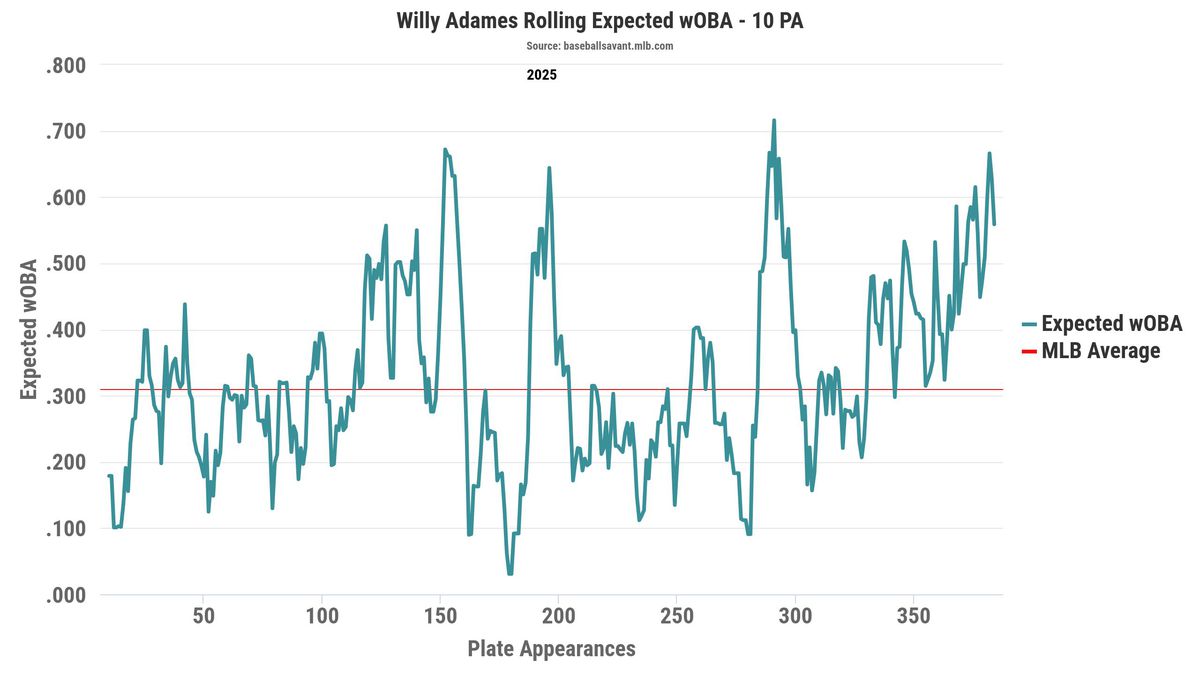But that’s putting the cart before the horse. Is Willy Adames’s hot streak sustainable? Oh god no. No streak is, but that’s not the point of this post. As with the one I wrote back in May, the point is to demonstrate that he’s rounding into form.