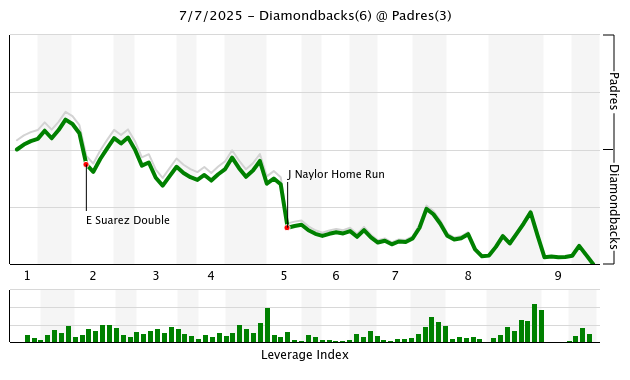 Fortunately, the offense – all but absent on Sunday – had arrived in San Diego. A Eugenio Suarez double in the second scored Josh Naylor, on the move with the pitch, all the way from first. That tied things at 1-1, and in the third, Arizona took the lead when a Lourdes Gurriel single scored Corbin Carroll. But the big blow came in the top of the fifth: Naylor smashed his 11th home-run of the year (above), a two-run shot that also scored Gurriel. It made the score 4-1, and Gallen was looking increasingly impressive. He was spotting his fastball, which played up his curve nicely. He may not have had a better inning this year than the fifth, where he K’d Martin Maldonado, Fernando Tatis and Jackson Merrill.