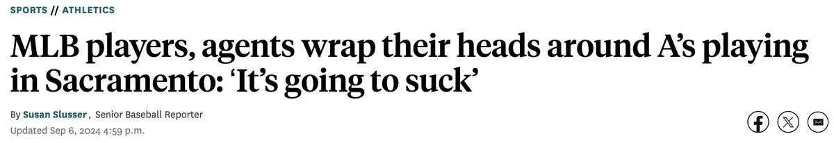 Well then. Burke notes that Oracle Park and the Oakland Coliseum are the only MLB-quality parks within a reasonable distance of Sacramento, but logistics likely would prevent playing any postseason games there. And if you think “postseason” is a distant dream for the A’s, I will note that the A’s are 33-26 since July 1, one of the best records in the American League. They’re likely to improve this year by nearly 20 games from their 112-loss season in 2023 (and the Cubs had better take them seriously when they visit Wrigley Field next week). It’s not impossible for the A’s to make a run at a wild card in 2025.