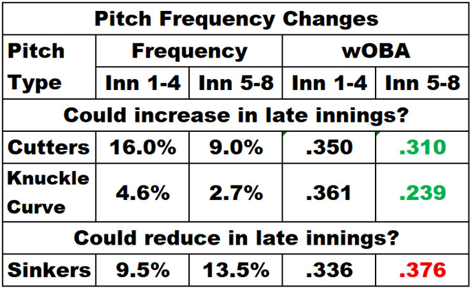 It is possible that pitching results in innings 5-8 could be improved by increasing the frequency of cutters and knuckle curves, and by reducing the frequency of sinkers. However, other important factors are the capabilities of each pitcher, and the sequencing of pitches thrown to each batter.