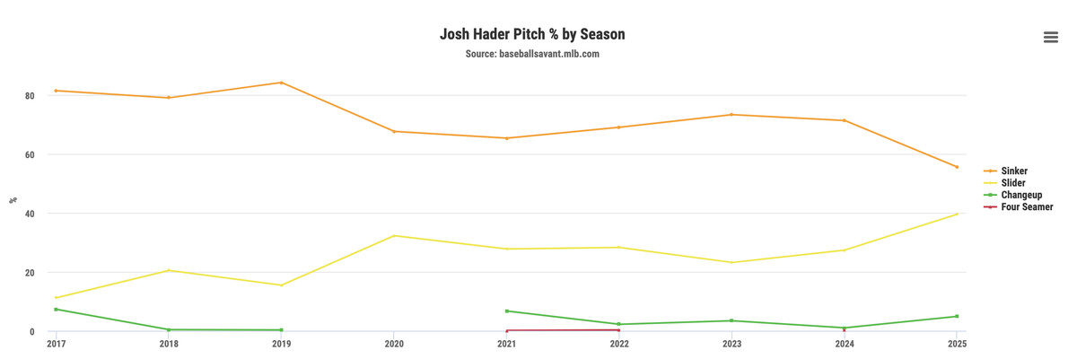Of all pitchers with at least 50 innings pitched last season and 40 innings pitched in 2025, Hader is tied with Casey Mize for the largest increase in fly ball rate (12.6%) from 2024 to 2025. If the season finished today, Hader’s 65% fly ball rate would easily be a career-high. Most of that increase has come at the expense of his ground ball rate (16.3%), with a decline of 14.1% compared to last year. No other pitcher, using the same criteria as earlier, has seen a larger decrease in their ground ball rate.