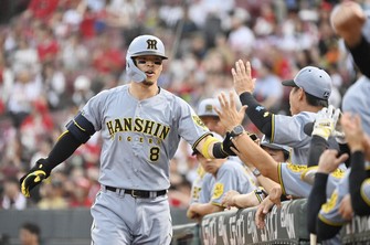 Teruaki Sato of the Hanshin Tigers is congratulated by teammates after hitting a solo home run in the second inning of a game against the Hiroshima Carp on July 9, 2025, at Mazda Stadium in Hiroshima. (Kyodo)
